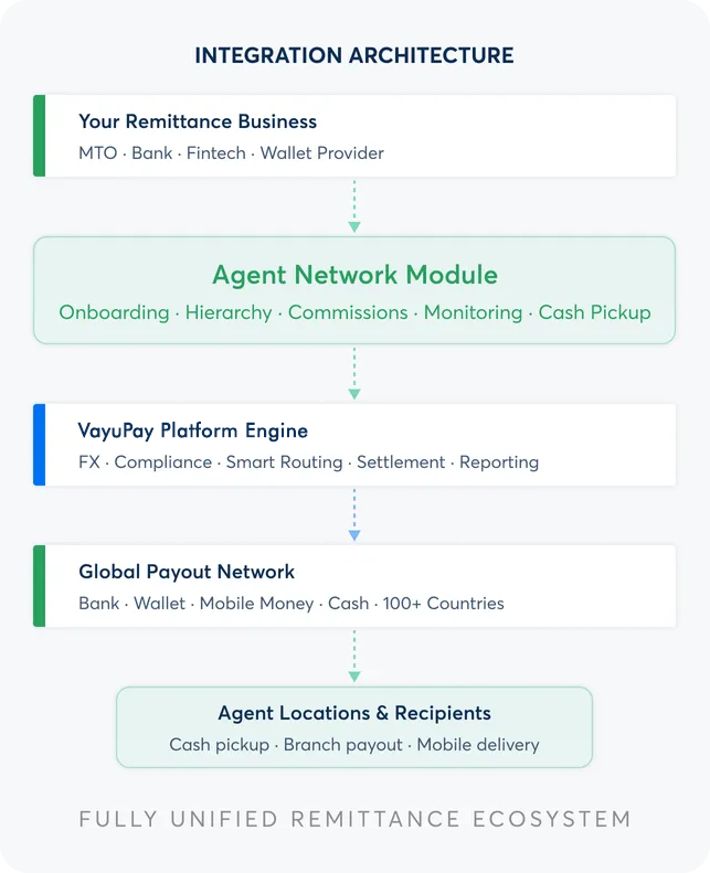 The agent network module integrates with remittance engines, FX systems, compliance monitoring, and payout networks for seamless agent remittance operations.